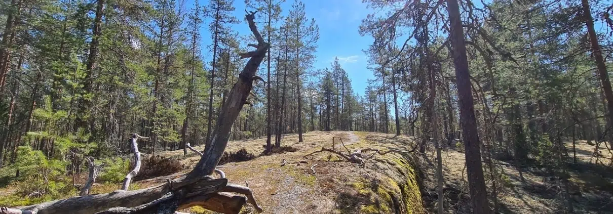 Reittimerkinnät ovat sinisiä – joko maalimerkkejä tai kuitunauhaa. Polun alku oli näin keväällä melko kostea. Lenkkareilla oli huono kulkea, mutta kosteimmat kohdat sai jotenkuten väistettyä. Hieman myöhemmin (kuten alla olevassa kuvassa) polku on kuivassa kangasmaastossa.