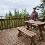 Hieman yli kilometrin kohdalla on penkki, johon voi istahtaa tauolle. Avointa järvimaisemaa täällä ei oikein ole, tätä voisi ennemmin kutsuttua rajoitetuksi järvinäköalaksi. Pysähdyin hetkeksi kahville ja munkille. Tapasin tässä myös kaksi maastopyöräilijää, jotka olivat pitäneet taukoa juuri ennen minua. Olen itsekin ajellut Hakin kierroksella sähköavusteisella maastopyörällä ja voin suositella – sekin on mukavaa näillä harjuilla. Niinkuin kävelykin.
