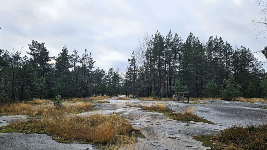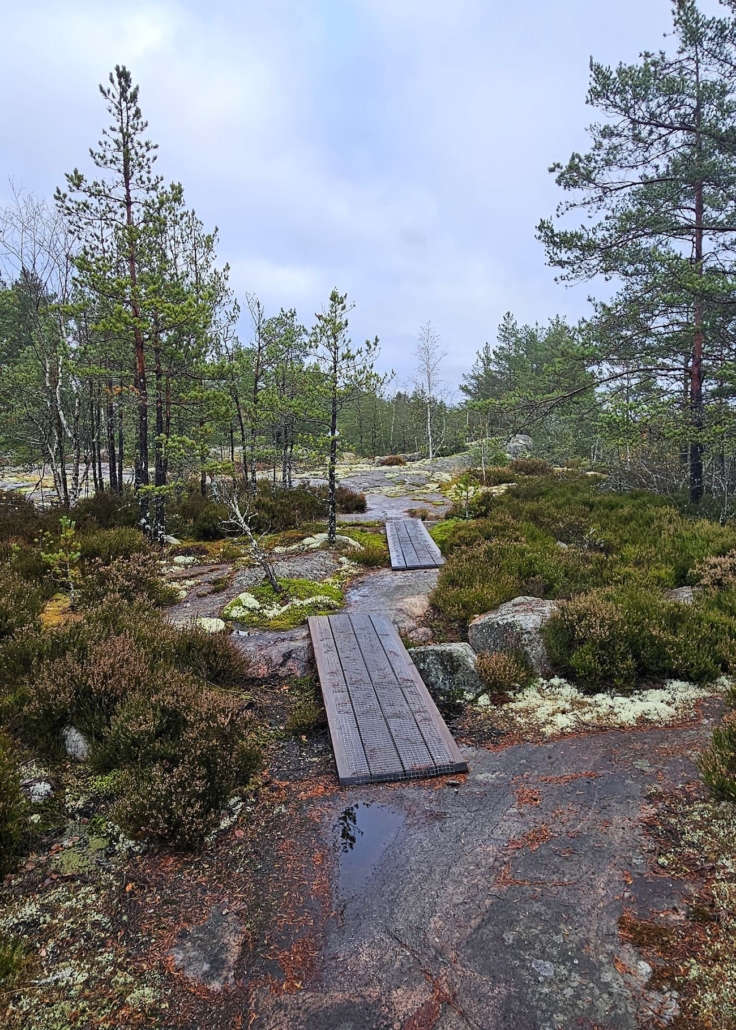 Pysäköintipaikalta Långmossabergetille kulkeva polku oli osuutta, jota en ollut aiemmin kävellyt. Kun parin kilometrin kohdalla saavuimme risteykseen ja käännyimme kohti Brändöskatania, olin taas tutulla osuudella. Edellisenä syksynä olin kävellyt Råbergets rundan ja Brändöskatans bulevard-reitin yhdistelmän ja kulkenut tätä samaa polkua. Risteyksen lähellä ollaan reitin korkeimmalla kohdalla, reilut 20 metriä merenpinnan yläpuolella.