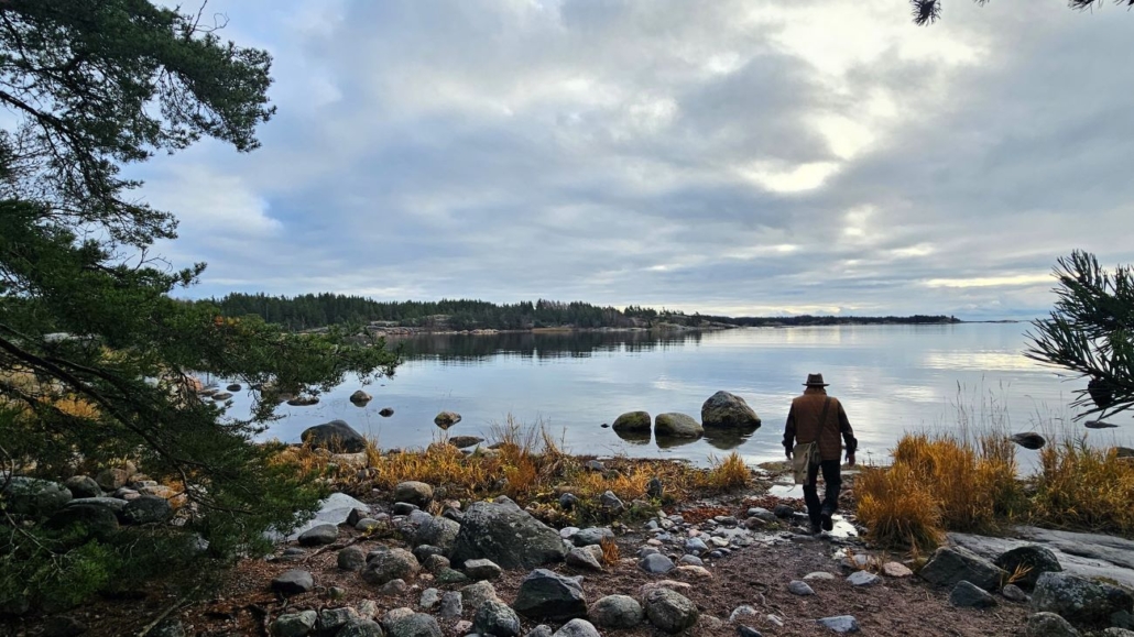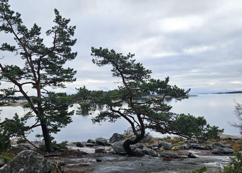 Vielä muutama sata metriä samaa reittiä Rävbergetin reippailun kanssa. Tässä ohitetaan muun muassa tämä komean vänkkyrä merenrantamänty, jota kaveri sanoi joskus käyttäneensä taukopaikkanaan. Puun rungolle kun voi helposti istahtaa. Korostanpa vielä, että marraskuisena aamuna kalliot olivat melko liukkaita – täällä piti varoa askeleitaan. Emme täysin välttyneet kaatumisiltakaan, mutta vammoilta sentään vältyttiin.