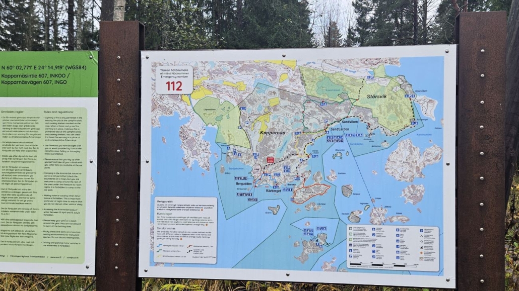Pysäköintipaikalla on Kopparnäsin infotaulu. Kustrutt puuttuu vielä kartasta. Polun linjauksen voi vilkaista vaikkapa Uudenmaan virkistysalueyhdistyksen sivulta.