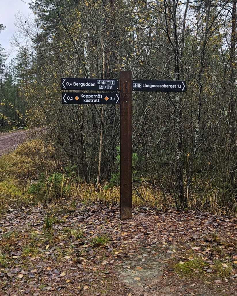 Kopparnäsintiellä on viitta kohti Långmossabergetiä, joka on reitin pohjoisin piste ja myös korkein kohta.
