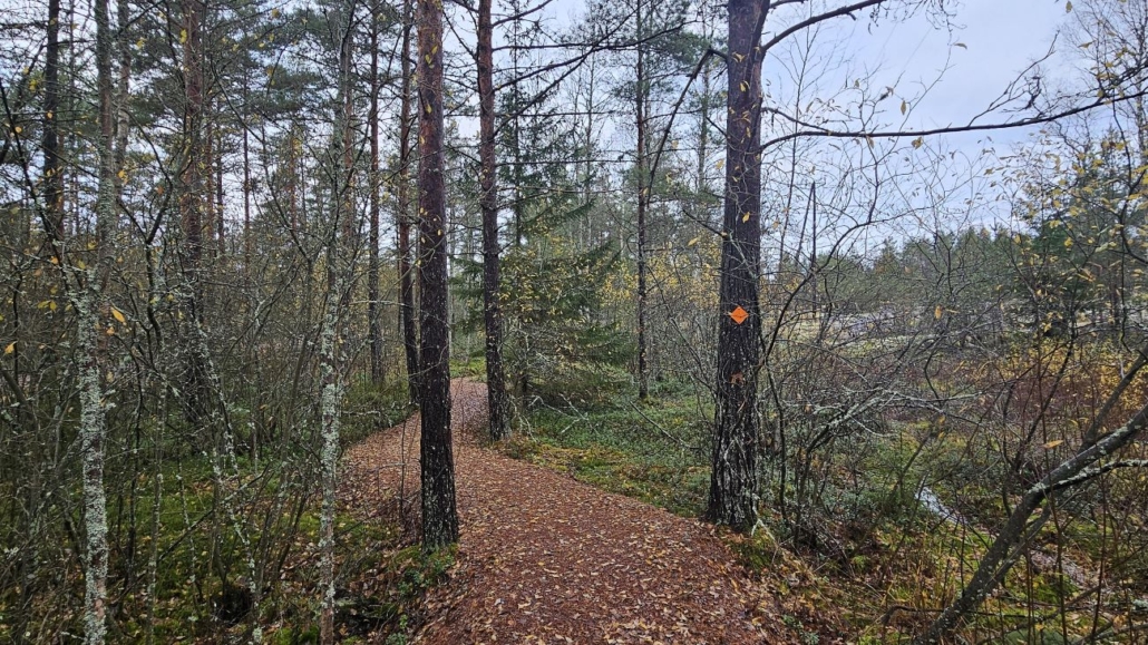Lyhyt suo-osuus tieltä poistuttaessa on sorastettu. Tälläkin polulla oranssit vinoneliöt toimivat reittimerkkeinä.