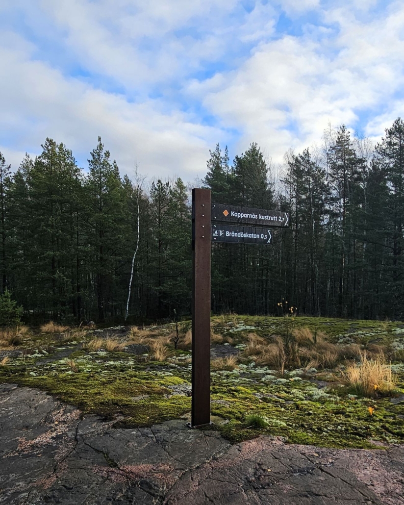 Nyt tulee monimutkainen selitys tästä ensimmäisestä polkujen risteyksestä: jos aloitat kävelyn samasta paikasta kuin me (Kallioniemi/Bergudden -tien päästä), niin voit kävellä tästä myös suoraan Kopparnäsintielle, jonne on vain viitisenkymmentä metriä. Voit myös kääntyä oikealle, koska polku vie Kopparnäsintien parkkipaikan kautta lopulta samaan paikkaan. Jos aloitat reitin tältä isommalta pysäköintipaikalta, kuljet varmasti juuri viittojen mukaan.