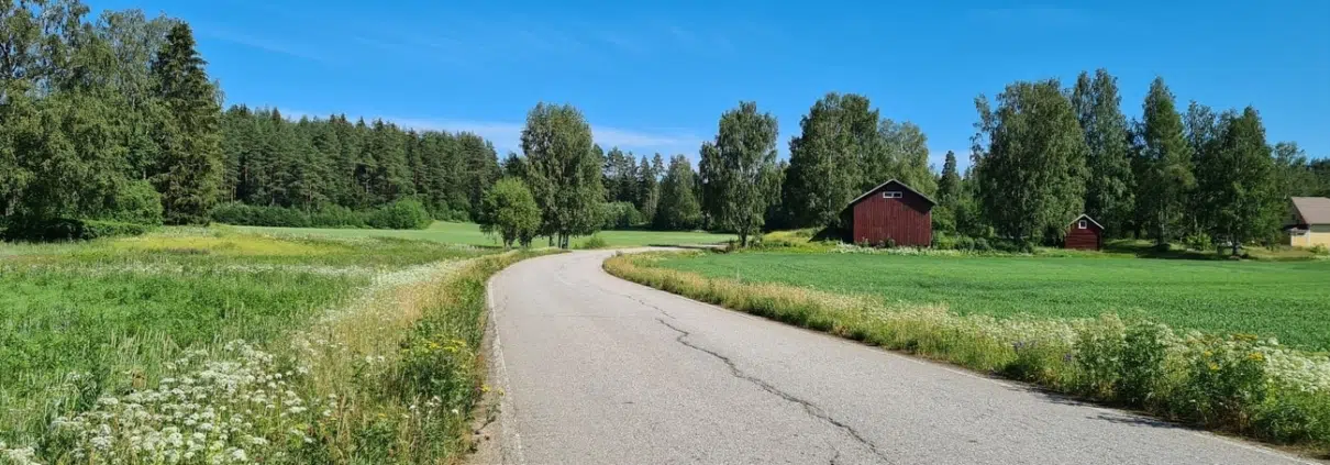 Rientolan pihalla ei ole opasteita luontopolulle, joten tässä täytyi tutkia nettisivulta löytyvää karttaa. Totesin, että Mukulintietä tulisi kävellä muutama sata metriä eteenpäin, jotta pääsisin varsinaiselle ympyräreitille. Mittauslaite päälle, vesipullo mukaan (oltiin taas lähellä hellerajaa) ja menoksi. Blogin pääkuvassa ollaan Mukulintiellä alkumatkalla – kauniissa maalaismaisemassa.
