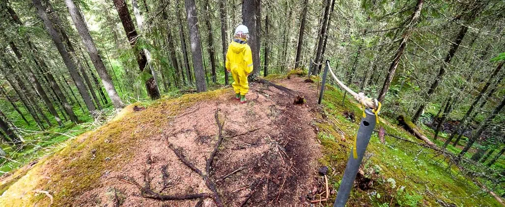 Reitti kulkee aluksi kuivan kangasmetsän halki. Nenään kantautuu tuoreen puun tuoksu. Saavumme upouudelle wc- ja huoltorakennukselle. Kivenheiton päässä on upea laavu, jonka nuotiopaikalla paistuvat mainiosti eväsmakkarat ja vaahtokarkit. Laavulta aukeaa satumainen näköala alas jyrkkäreunaiseen kanjoniin. Vanhempi lapsi lähtee ystävänsä kanssa kuvaamaan kanjonin pohjalla solisevaa puroa, ja toisen kanssa alkaa keijukuningasleikki.