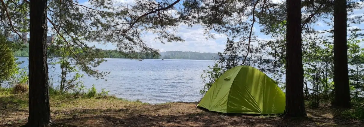 Eteläisessä kärjessä on mukava taukopaikka. Täältä löytyy myös reitin ensimmäinen tulipaikka, joka ei aivan näy tässä kuvassa. Rannassa oli telttakin (blogin pääkuvassa), muita ihmisiä en kuitenkaan tavannut. Maisema on hieno – mutta onhan se myönnettävä, että Heinolan voimalaitoksen ja flutingtehtaan (whatever that means, nämä laitokset katsoin kartasta) silhuetit ja savut eivät sitä kaunista.