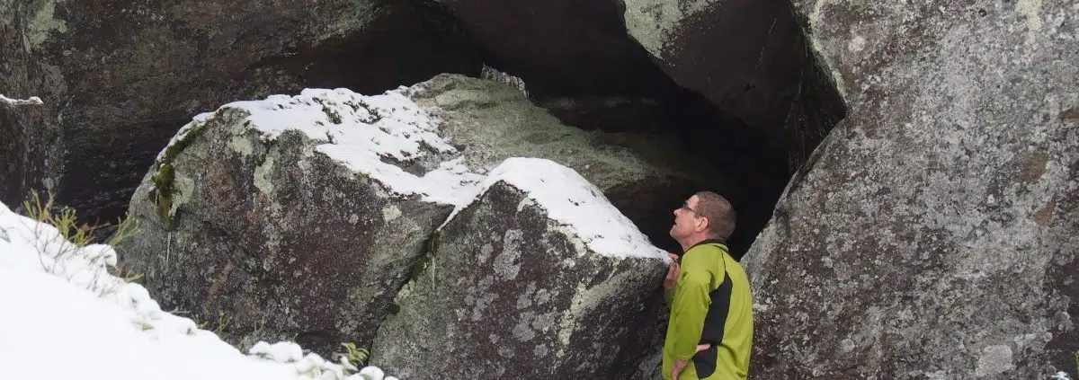 Huhtikuun alussa oli tullut vihdoin se otollinen hetki laittaa lumikengät jalkaan ja painua mehtään. Usein musta varjo kalliossa on osoittautunut harhaluolaksi, ja karttamerkit eivät kerro lohkareiden koosta, joten lähtiessä ajattelin, että tänään pitää henkisesti valmistautua siihen, että en löydä mitään.