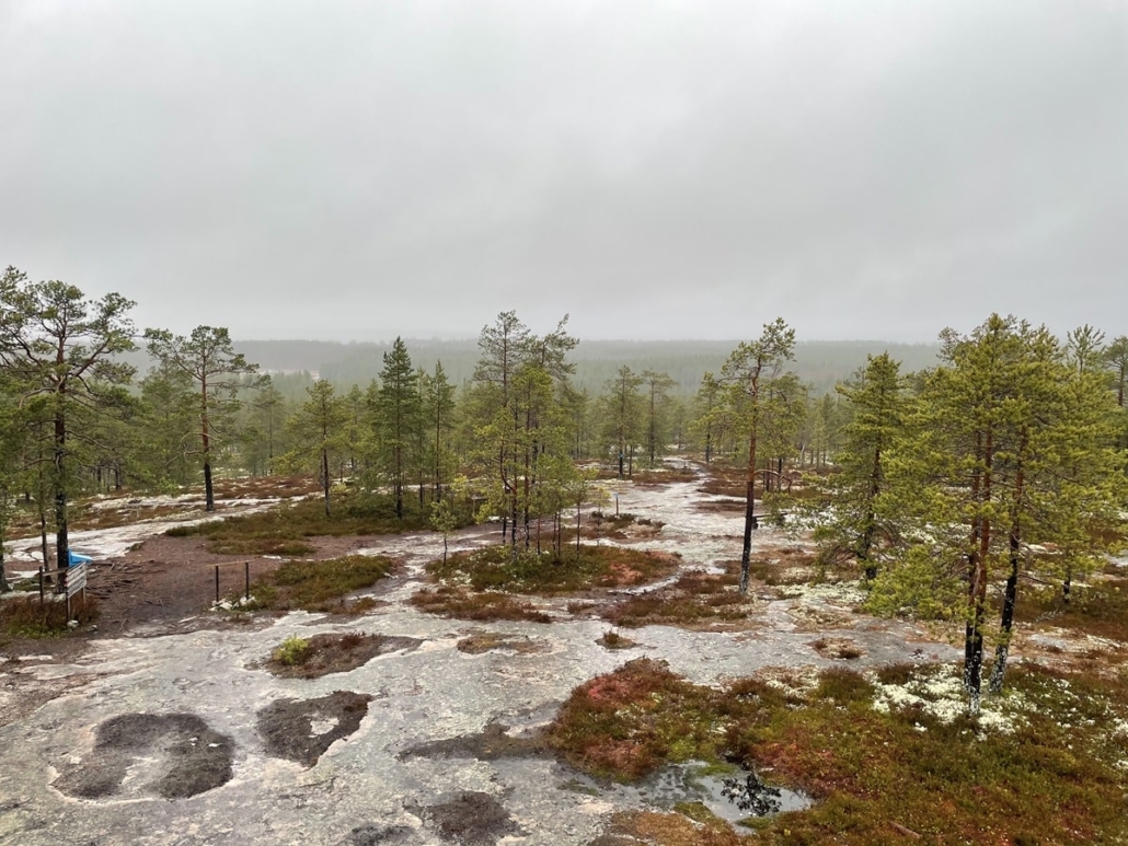Noin kilometrin jälkeen saavuin Akkovaaralle, jonka päällä on myös näkötorni. Ympärillä avautui avokallioinen vaaranlaki sammal- ja jäkälälaikkuinen. Akkovaaran jälkeen hieno kalliomaasto jatkui. Paljakankallioilla sumukin hälveni se verran, että ylväs Ärjänsaari mäntyturkkeineen erottui Kainuunmereksi kutsutulta Oulunjärveltä.