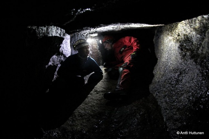 Sen enempiä aikailematta kävimme peremmälle. Ensimmäisenä kohtasimme pari metriä yläviistoon menevän käytävän, jota pitkin saattoi helposti kiivetä. Lakipisteessä oli hieman suurempi tila ja sen toisella puolella luola jatkui taas alaspäin.