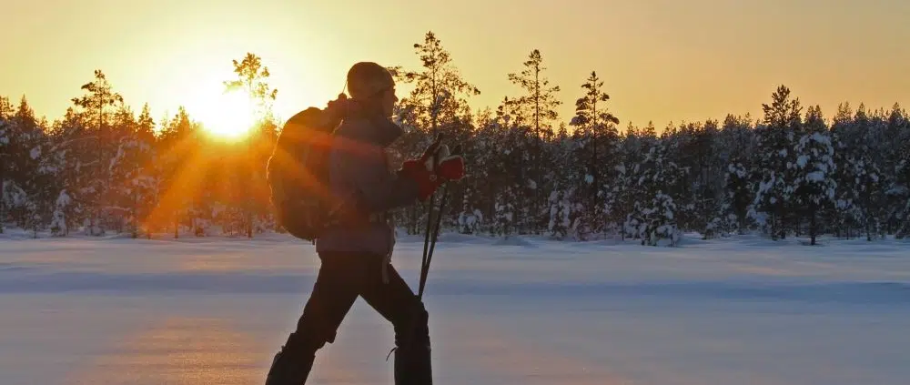 Pakkasta oli melko tuikeasti, kun lähdimme hiihtämään harvapuustoista rämettä pitkin kohti Lentuan rantaa. Itse aurinkoa ei näkynyt, mutta se punasi mäntyjen latvat oikealla puolellamme. Tammikuussa ei vielä ole hankikantoa, mutta pitkillä metsäsuksilla hiihtäminen oli riittävän keveää.