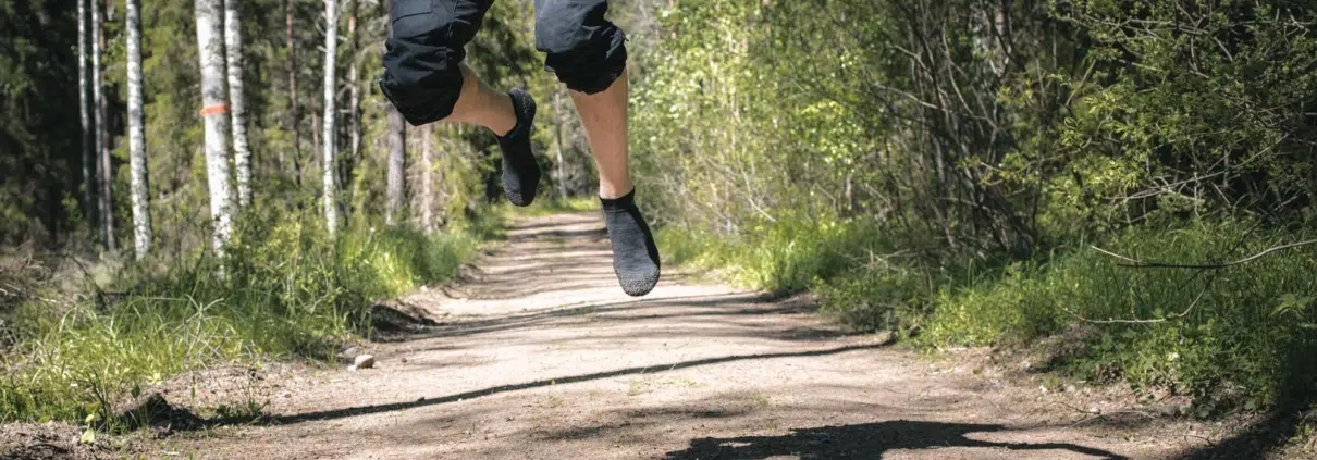 Jarno: Aika monta kertaa on vahingossa tullut astuttua koko painolla terävän kiven tai juurakon päälle, mikä ei tunnu hyvälle. Näillä kävellessä tai juostessa huomaa katsovansa tarkemmin mihin astuu, ja ehkä maiseman katselu jää silloin hieman vähemmälle. Sukkakenkien murupohja on pehmeämpää materiaalia kuin paljasjalkakengissä yleensä, ja on lähempänä paljain jaloin kävelemistä. Hyvä puoli on tuo luonnollinen tuntuma ja lämpötilojen aistiminen pohjan kautta, mutta pohja ei suojaa niin hyvin jalkoja teräviltä sattumilta.