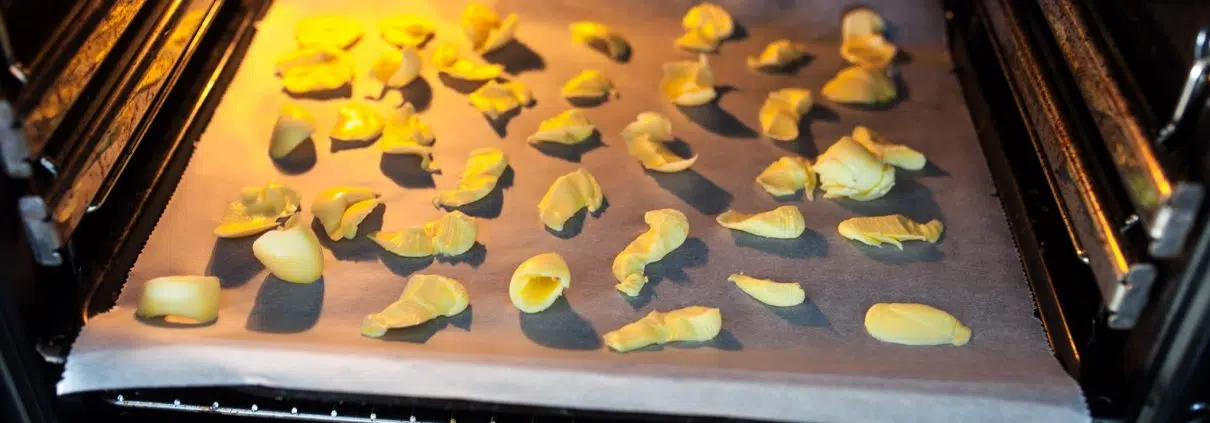 Ensin voista vuollaan kolmesta viiteen senttiin pitkiä, ohuita lastuja, jotka levitetään pellille leivinpaperin päälle ilmavasti. Lastut kannattaa asetella mieluummin liian harvasti kuin tiheään, jotta lopputulos on parempi.
