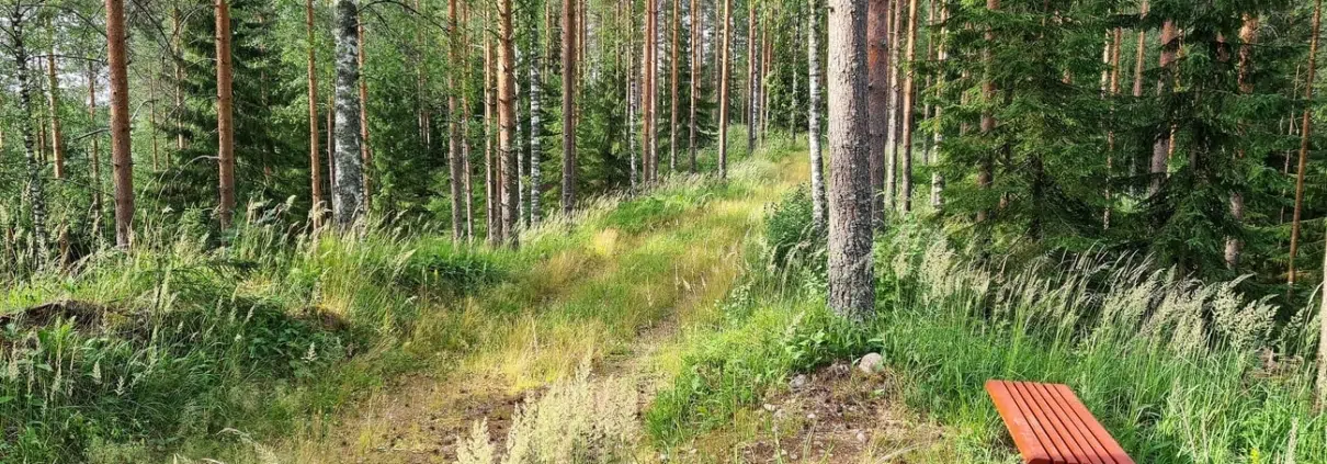 Noin kilometrin kävelyn jälkeen ulkoiluväylä vaihtuu metsätieksi kauniissa koivikkomaisemassa – seuraava osuus on noin puolen kilometrin suora tätä tietä pitkin.