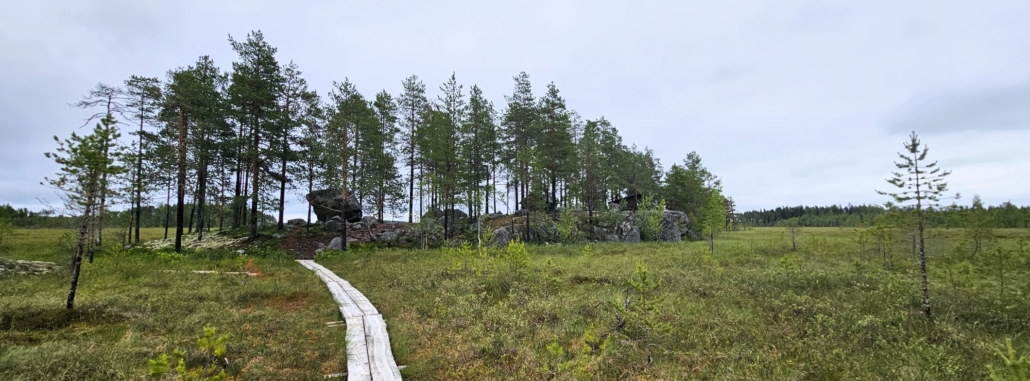 Reitti käy vielä pienellä metsäsaarekkeella suon keskellä. Sen jälkeen lyhyt avosuo-osuus uusine pitkospuineen (jossa blogin pääkuva on otettu) ja saapuminen Kalliosaarelle, jossa laavu on. Lähistöllä on myös puuvaja sekä puusee. Istahdin kahvitauolle laavun ääreen.