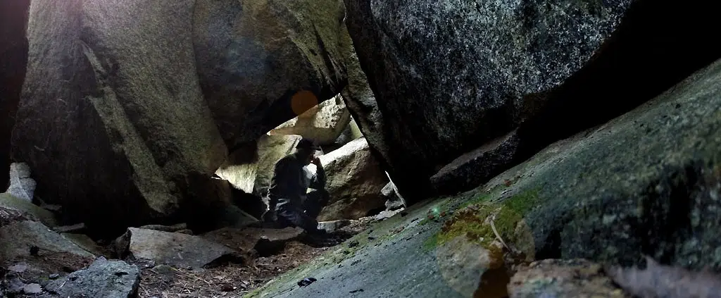 Itse istun luolan toisessa päässä, Matin hahmo näkyy luolan suulla.