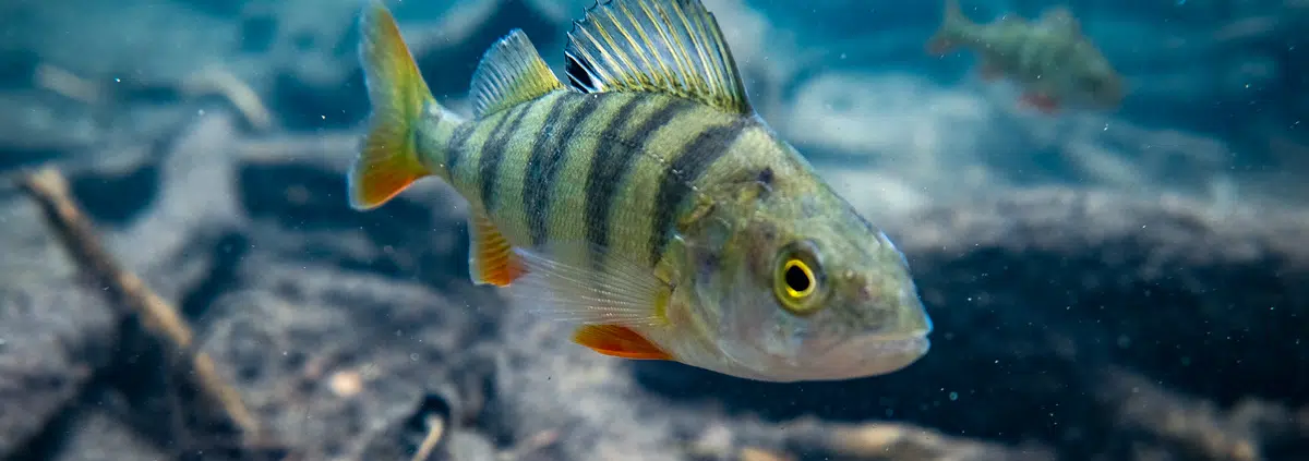 Lahoavien oksien kainaloista kohosi hulmuavia vesikasvien varsia kohti korkeuksia. Ne tarjosivat turvapaikkoja pienemmille kaloille. Ahvenet täällä eivät kuitenkaan olleet arkajalkoja, vaan tekivät läheistä tuttavuutta esimerkiksi kamerani ja varpaideni kanssa. Ahventen kanssa snorklatessa kannattaa aina välillä vilkaista taakseen – kokonainen pieni parvi saattaa huomaamattasi seurata sinua vanavedessäsi.