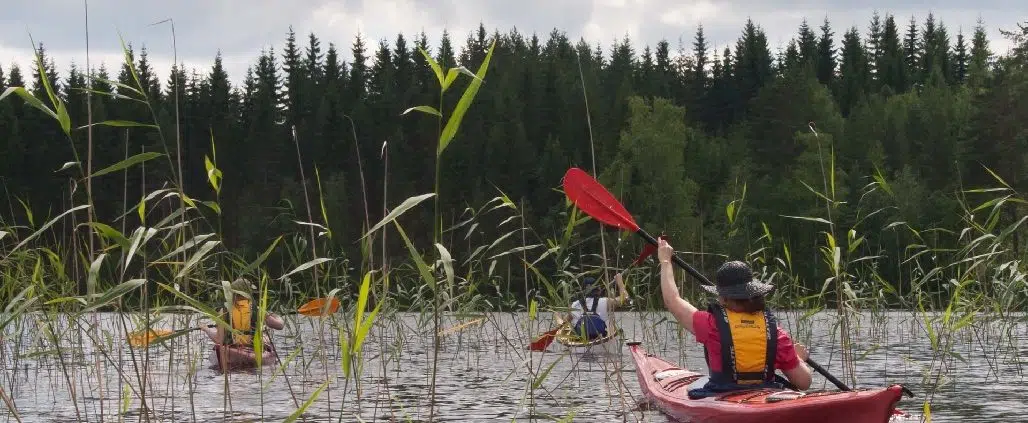 Porukassa on turvallista ja mukavaa meloa. Melojat kaislikossa. Kuva: Paul Räihä, Rautalammin kunnan kuvapankki.