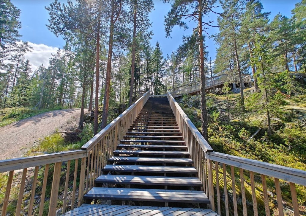 Laavun takaa löytyy vielä toinenkin vaikuttava ilmestys, nimittäin suuret, jopa 190 askelman kuntoportaat. Valitsemme laskeutua laavulta kuntoportaita pitkin, mutta vaihtoehtona on myös jo tutuksi käynyt sorastettu kuntorata, jos olisimme liikkeellä vaikkapa lastenvaunujen kanssa.