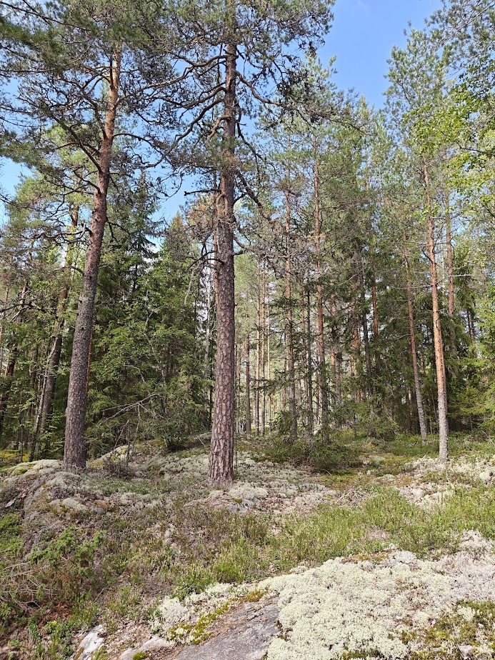 Hiljalleen askeleet vievät meidät ylös mäkeä. Metsä alkaa muuttua hieman käkkäräisemmäksi ja kallioisemmaksi, mäntyjen kaarnat paksummiksi ja maapohja jäkäläisemmäksi. Maastokarttaan on merkitty tulipaikka, minkä olin huomannut ennen retkeä karttaa tutkiessani. Lähestymme merkittyä kohdetta ja odotamme, löytyisikö sieltä jotakin.