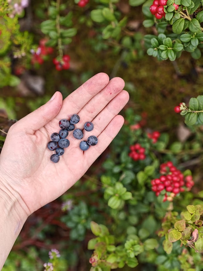 Kyykkään hieman myös metsän puolelle ahtamaan suuhuni suuria mustikoita ja ensimmäisiä kypsiä puolukoita.