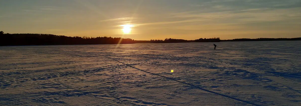 Päästyämme Laivonsaaren luoteiskärkeen käännymme rannan suuntaisesti takaisin kohti Kuopiota. Sitten päätämme seurata Laivonsaaren kupeesta lähtevää moottorikelkkauraa kohti Päivärantaa ja Kallansiltoja. Selällä pari hiihtäjää luistelee vauhdikkaasti kohti aavaa ulappaa jonnekin Maaningan suunnalle. Aurinko laskee selkämme taa, Kallan sillat ja Puijonsarvennenä häämöttävät horisontissa. Täydellistä.
