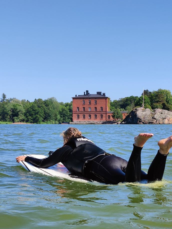 Lapinlahti vaikutti aluksi kovin pieneltä altaalta ja mietin, mitenkä mahdamme kaikki kolme mahtua liikkumaan alueella. Olimme myös saaneet ohjeet turvallisen syvyisellä alueella liikkumisesta. Jossain kohtaa turvallisen vesialueen reuna tulisi kuitenkin vastaan, joten oli syytä opetella kääntymään laudan kanssa.