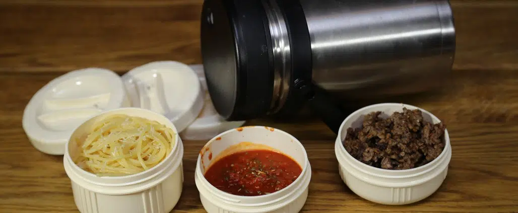 Keitin spaghettia, paistoin jauhelihan ja lämmitin kastikkeen. Suljin jokaisen omaan pieneen rasiaansa ja laitoin ne esilämmitettyyn termosastiaan. Termari reppuun ja metsään.