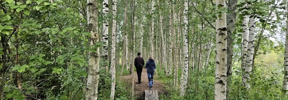 Seuraavaksi siirrytään taas kuivalle maalle ja haketetulle polulle koivujen katveessa.