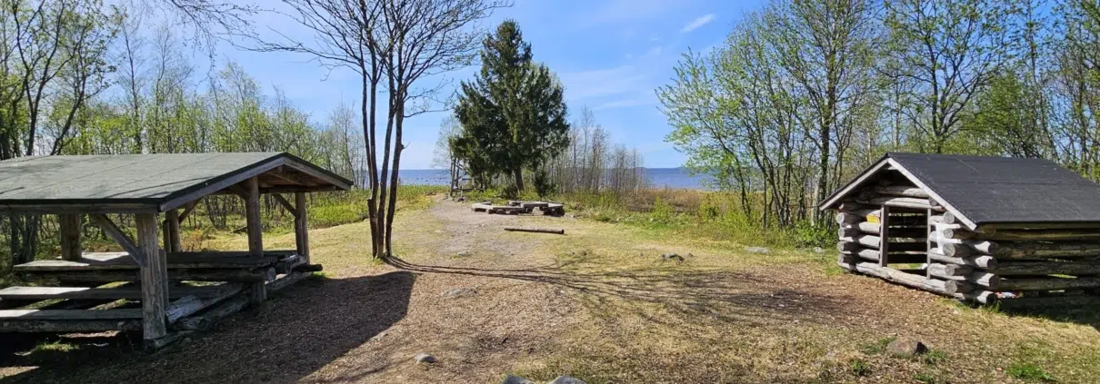 Taukopaikalla on piknikpöytä katoksineen, tulipaikka ja puuvaja sekä lintutorni (joka tässä kuvassa on kameran takana). Blogin pääkuvassa sama paikka merta kohti kuvattuna, lintutorni näkyy siinä kuusen takaa.