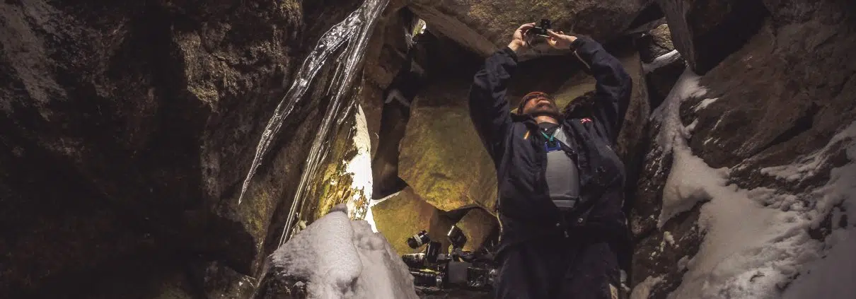 – Täällä on luola! Täällä se on! kuului huuto jyrkänteen juurelta. En saanut vielä silloin tarkalleen selvää, kuka sieltä huuteli, mutta selkeästi alkoi tulla porukkaan vipinää. Kameramiehellä oli ahkioon sidottuna hervottoman kokoinen kamerajalusta ja matkalaukku, jonka sisällä oli seurueen arvokkain omaisuus eli tuotantotason videokamera. Sille tuli nyt tarvetta.