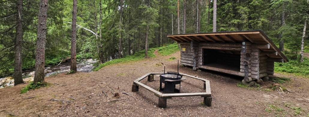 Taukopaikan varustelua. Laavu, tulipaikka ja piknikpöytä, taustalla puusee.