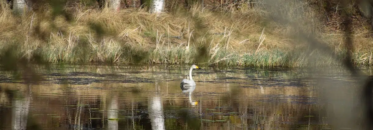 Sarsansuoksi ja pelloiksi muuttuneen muinaiskosken syvimmät poukamat tarjoavat nykyisin suojaisan pesäpaikan joutsenille.