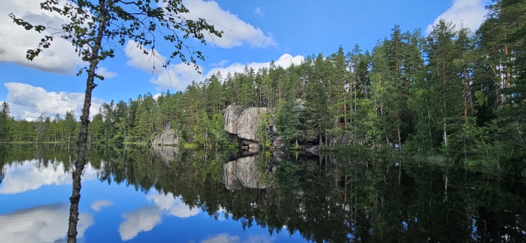 Riippukallio on järven itärannalla, ja reitti kulkee pitkin etelärantaa. Välillä käväistään hieman kauempana rannasta, metsän suojassa. Hämmästelin kesän 2025 kuvia katsellessani, että olin ottanut ihan vahingossa muutaman valokuvan täsmälleen samasta paikasta kuin edellisellä kerralla – yksi niistä kuvista juuri tämä.