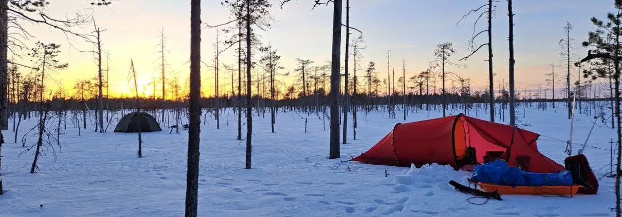 mehutiivisteellä ja poretableteilla aikaansaadun esanssilitkun sijaan. Pilviä alkaa kerääntyä taivaalle ja lämpötila onkin noussut muutamilla asteilla. Auringonlasku ilahduttaa kuitenkin vielä puiden lomasta. Yöstä tulee lähes tuskaisen kuuma, vaikka varustus on sama kuin edellisenä yönä, eikä teltan tuomaa hienoista lämmitysvaikutustakaan ole. Olen siis onnistunut lämmittämään kroppani hyvin ennen nukkumaan menoa.