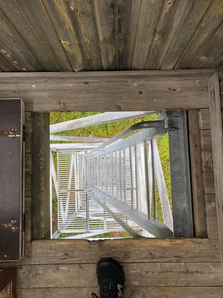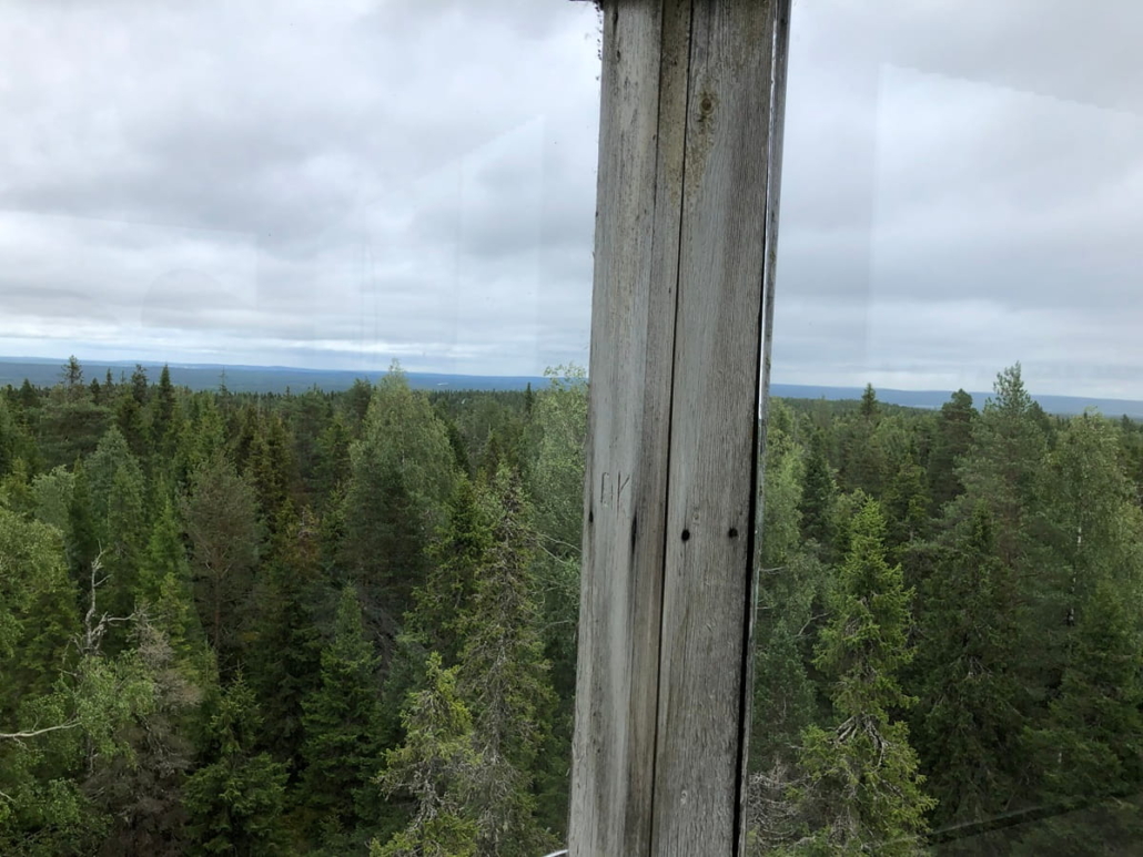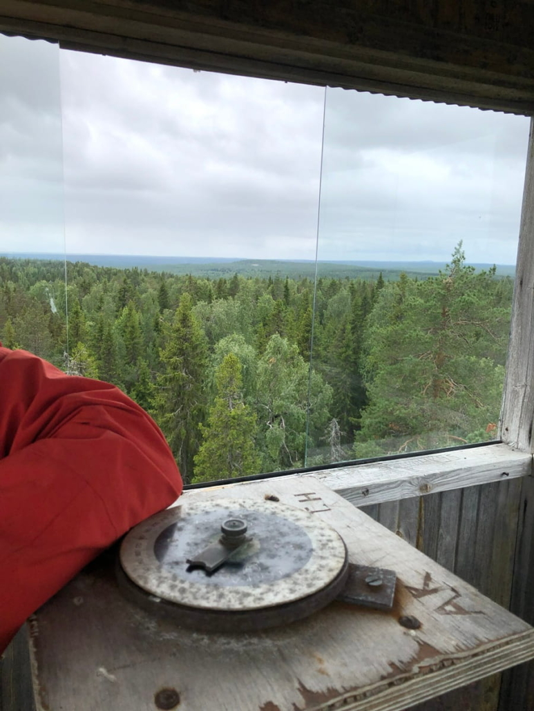Ennen evästaukoa kiipesimme vielä parinkymmenen metrin päässä sijaitsevaan palovartijan torniin. Vaikka korkeus huimasi hiukan, pleksilasit ympärillä tarjosivat hyvän suojan. Tornista avautui upea maisema kauas Etelä-Lapin loiville vaaroille ja metsiin.