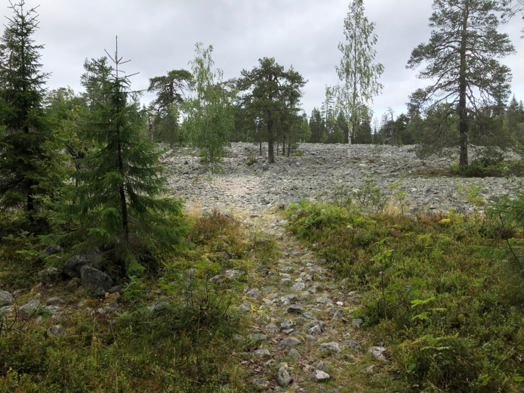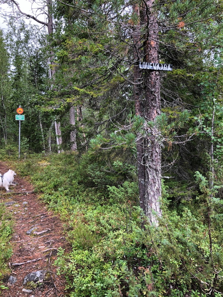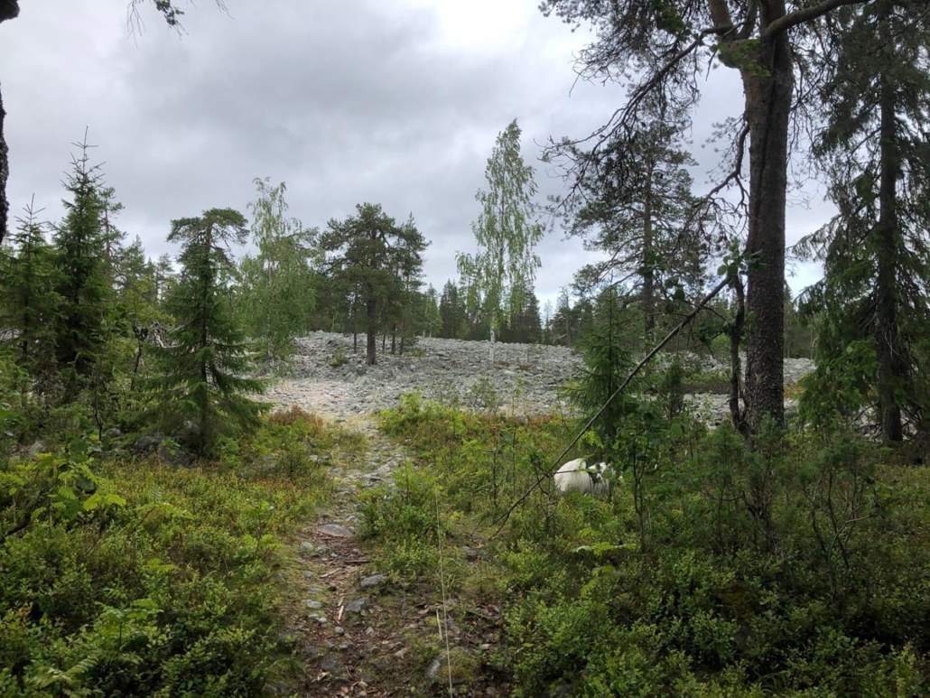 Jätimme auton kääntöpaikalle ja lähdimme seuraamaan aluksi mönkijäuraa, josta varsinainen polku sitten erkani. Itse polku oli perinteistä, juurakkoista ja kivistä kinttupolkua, joka mutkitteli havumetsän siimeksessä. Reitin hienoin yllätys koitti, kun metsä aukeni ja eteen avautui muinaisranta, vain kiviä näkyi vaikka kuinka pitkälle. Ylitimme rakan ja kohta olimme takaisin metsässä. Jatkoimme matkaa loivasti ylöspäin kohti Louevaaran huippua.