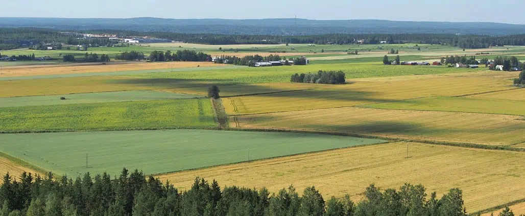 Maisema Loukajanvuorelta peltojen takana siintävän Santavuoren suuntaan. Sen takana virtaa laaksossaan Kyrönjoki.