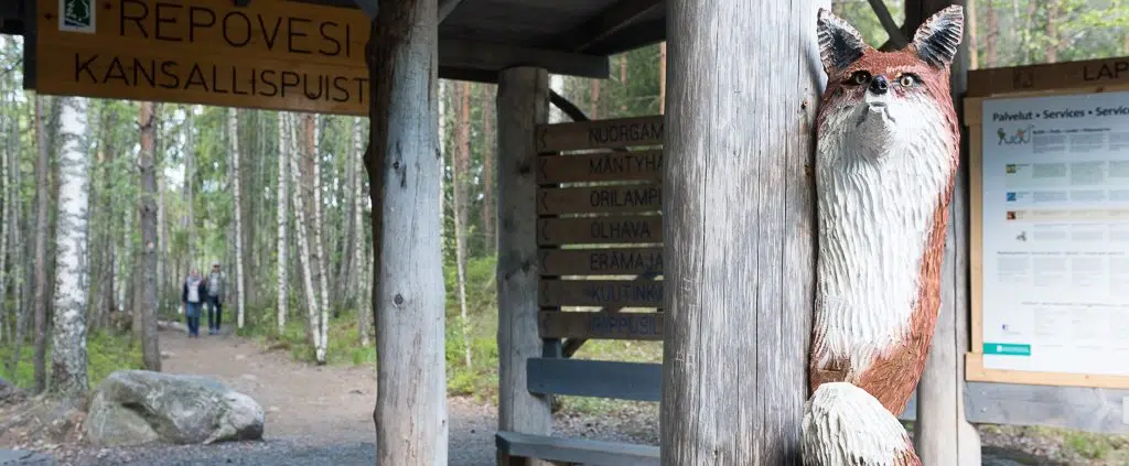 Ensimmäisen kerran nuoli näytti Lapinsalmenportille. Portilla seistessäni aloin kuin vaistomaisesti tutkia lähiympäristöä ja mahdollisia piilopaikkoja. Penkin aluset ja lautojen kolot ja välit ovat mainioita piilopaikkoja juuri geokätköille, ja eipä aikakaan kun hoksasimme ensimmäisen rastin. Seisoimme siis Repoveden kansallispuiston reunalla, ja seuraava rasti houkutteli meitä astumaan sisälle kansallispuistoon. Helposti on arvattavissa mistä geokätköilyssä on perimmälti kyse, kun sitä löytää välillä yllättävistäkin paikoista.