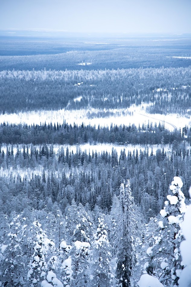 Hiljalleen metsän raoista alkoi pilkistää kauaskantoisia maisemia. Kuljin hitaasti lorvien ja luonnon ihailemiseen keskittyen. Minulla ei ollut kiirettä eikä halua hikoilla turhan päin. Katselin tykkylumen kuorruttamia puita ja huomasin, kuinka eteenpäin kulkiessani metsä alkoi harventua ja valaistua.