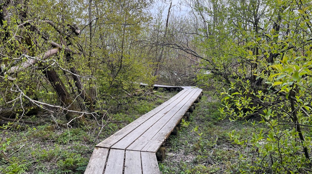 Kokemäenjoki virtaa vasemmalla puolellani. Sen yllä leijailee parvi kalalokkeja ja tiiroja, ja meteli on sen mukainen. Pysähdyn kuuntelemaan luodon lehtipuustosta kantautuvaa kuorolaulua. Pajulinnun pehmeät, sinitiaisen helisevät, peipon pirteät, tiltaltin tiputtelevat ja mustarastaan tummanpuhuvat säkeet saavat väistämättä hymyn kasvoille. Muutaman mutkan jälkeen pitkospuiden kuja päättyy, ja edessä siintää kapea koivukuja. Sen vasemmalla puolella on nuotiopaikka aivan joenrannan tuntumassa. Jos täällä mielii tulistella, pitää kantaa omat polttopuut mukanaan.