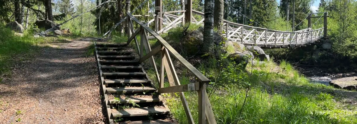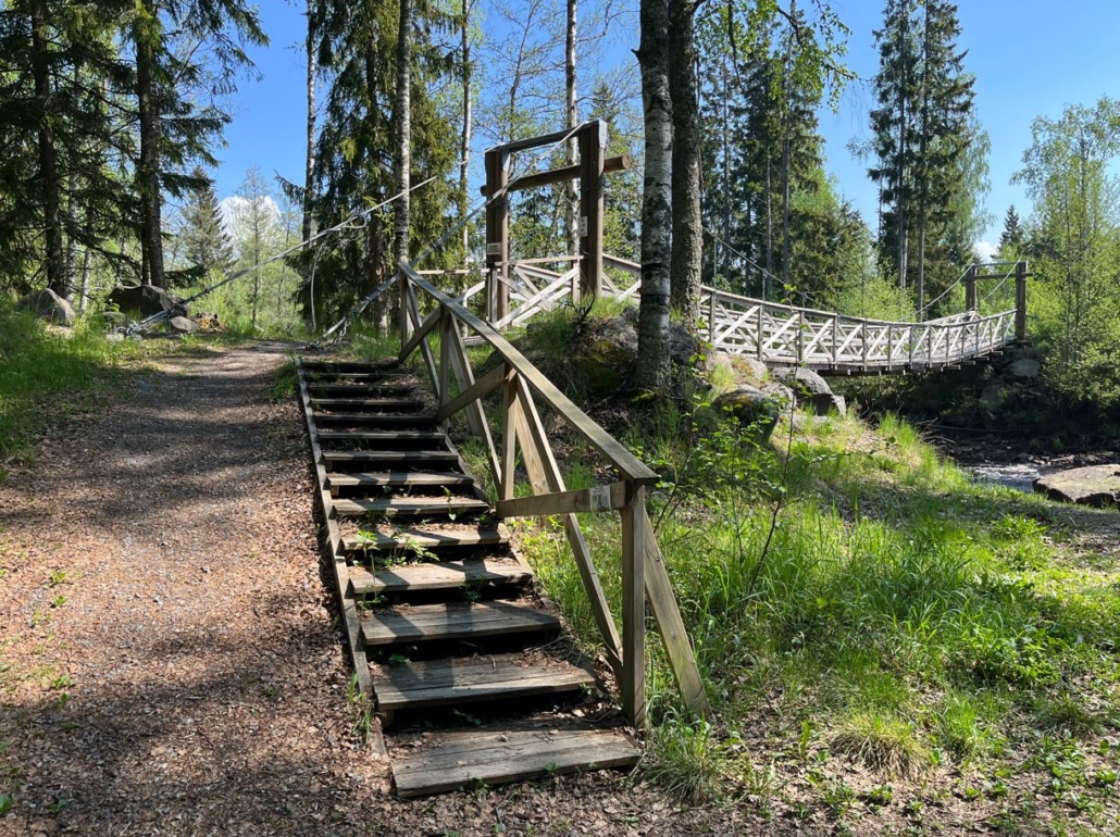 Laavun lisäksi Piinukoskelta löytyy hieno riippusilta, joka sijaitsee parkkipaikan vieressä, ja kohoaa korkeuksiin joen yläpuolelle. Astun sillalle ja kurkin maisemia sen molemmin puolin.