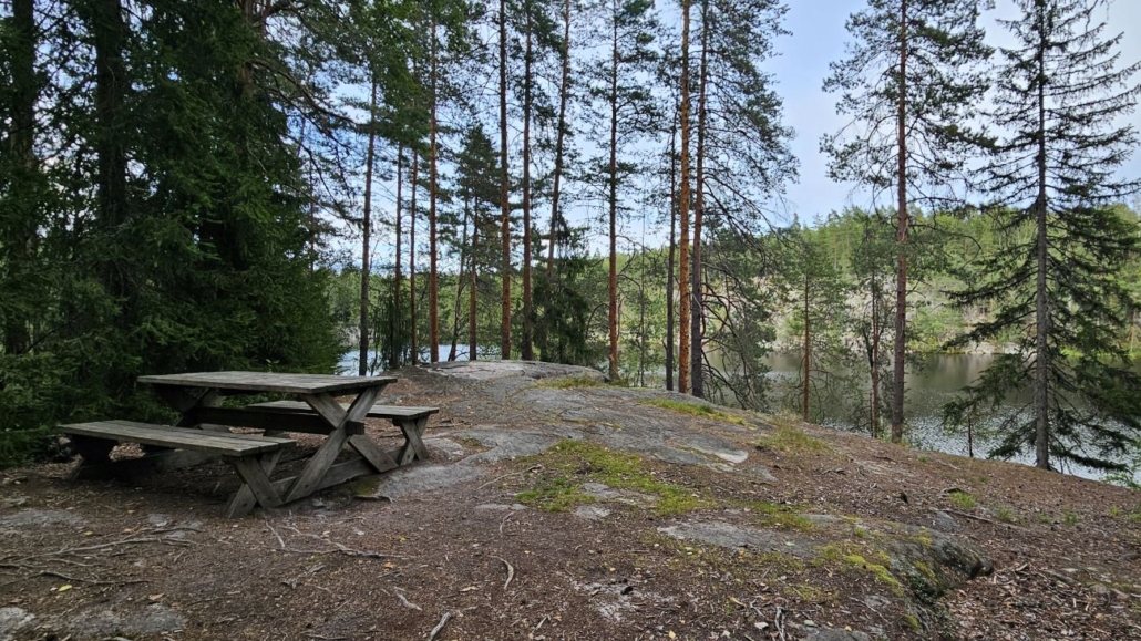 Halkolammen molemmilla puolilla on myös taukopaikkoja – ja reitin varrella on erinomainen keittokatos penkkeineen ja pöytineen. Molemmilla kerroilla katoksessa on ollut rauhallista. Suosikkipaikkani evästauolle tällä reitillä. Kävelyä on tässä takana noin viitisen kilometriä.
