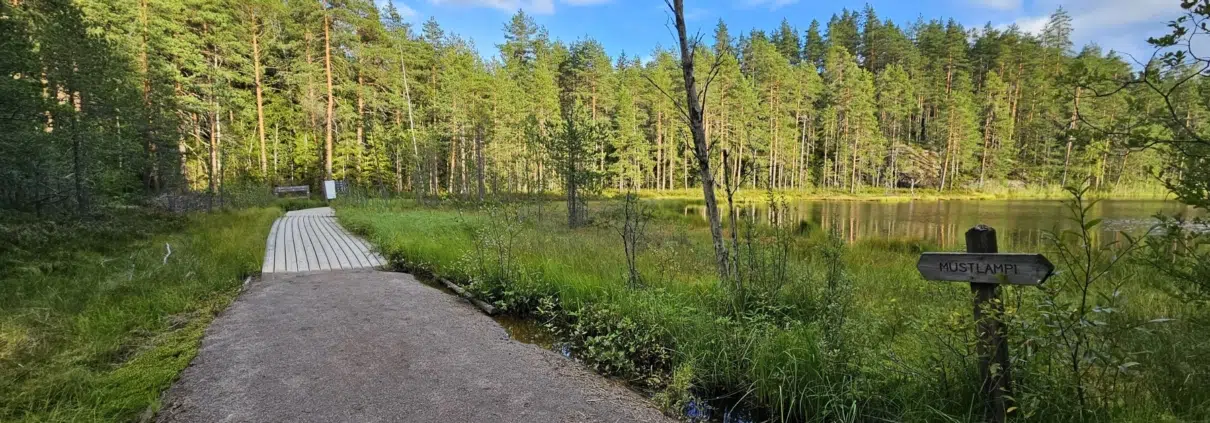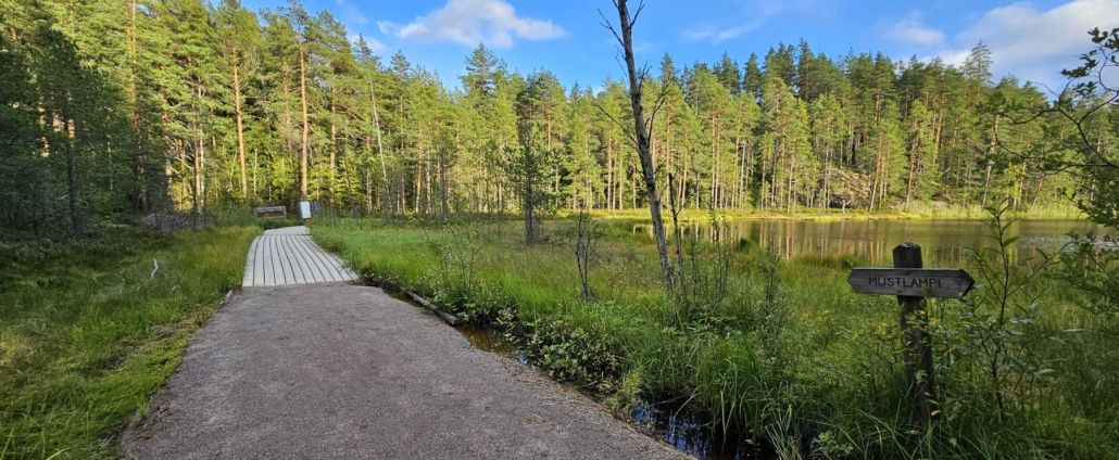 Mustlampi on pieni ja symppis suolampi, joka näkyy myös blogin pääkuvassa. Myös Mustlammen rannalla on kiva taukopaikka piknikpöytineen. Reitti jatkuu tästä Pyykorven lehmusmetsään. Taulun mukaan polun varressa on kookkaita luontaisesti syntyneitä lehmuksia mutta myös pensasmaisia istutettuja taimia.