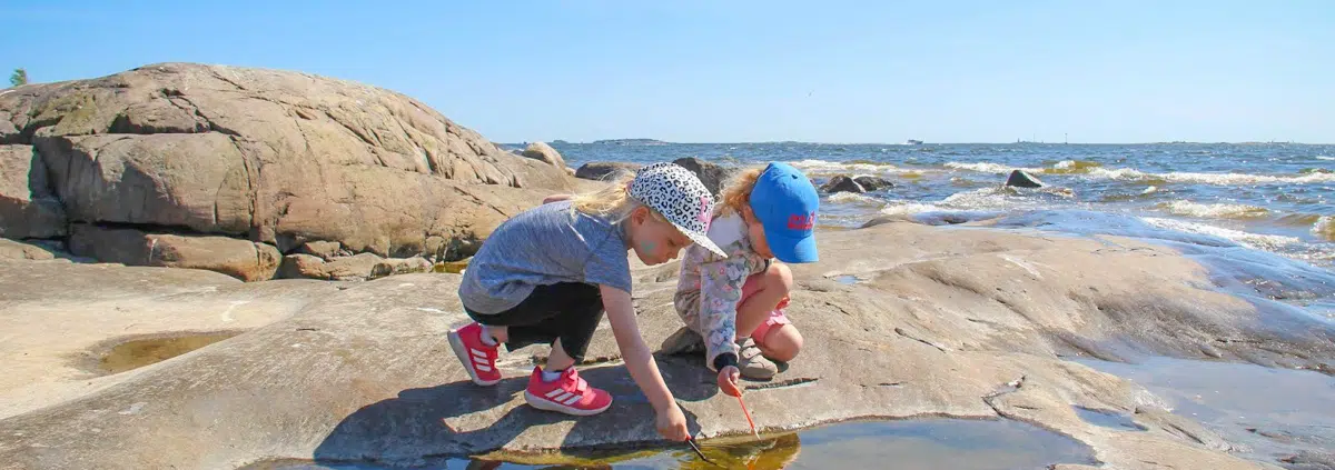 Me osallistuimme tarinalliselle saariseikkailuretkelle, joka aurinkoisena päivänä oli hyvin suosittu. Kannattaa retkeillä rohkeasti pilvisemmälläkin säällä, sillä silloin ryhmäkoko voi olla pienempi ja odottelua vähemmän. Oppaamme oli todella mukava ja huomioi hyvin koko porukan. Seikkailuretkellä ehdittiin saada komeat kasvomaalaukset, tunnistaa järvi-, murto-, ja valtameren vesinäytteet suolapitoisuuden mukaan, leikkiä, kulkea pitkospuilla ja maalata siveltimin viestejä kallioon. Jälkimmäisen aktiviteetin omin välittömästi retkipuuhaksi omillekin retkille!
