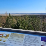 Alamäessä on luontopolun viimeiset luontotaulut kysymyksineen. Noin viisikymmentä metriä ennen kierroksen päättymistä voi tarkistaa vastaukset oven takana sijaitsevasta taulusta ja istahtaa penkille vielä hetkeksi. Tarkistimme vastaukset. Onnistuimme kohtuuhyvin, vaikka saukon ruuanhakumatkan arvaaminen menikin pieleen.