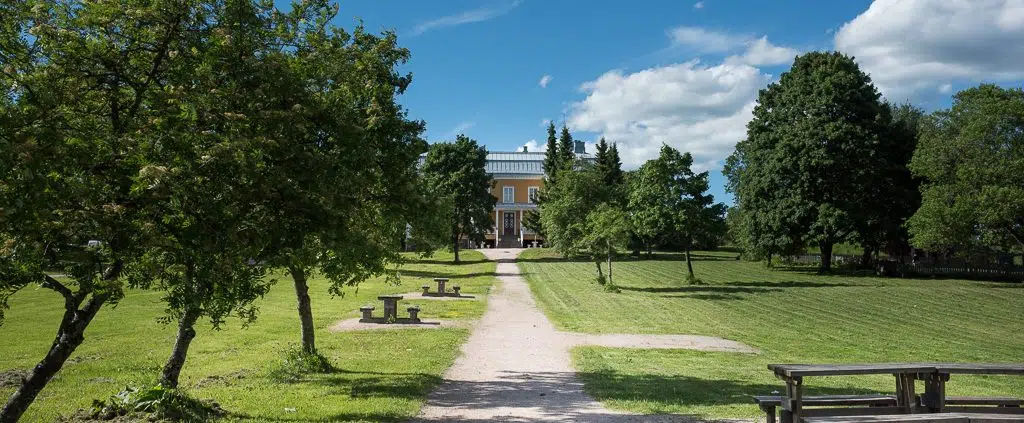 Tästä se kartanon piha sitten aukeaa. Taustalla siintää Luukkijärvi, ja matkaa sinne saa tehdä pihlajapuiden varjostaman polun halki. Muutaman sata metriä pitkä polku on suunniteltu siten, että kun oikein helteisenä päivänä sattuu sitä myöten astelemaan, niin voi matkan varrelle pysähtyä jäätelökioskille hankkimaan virvoitusta.