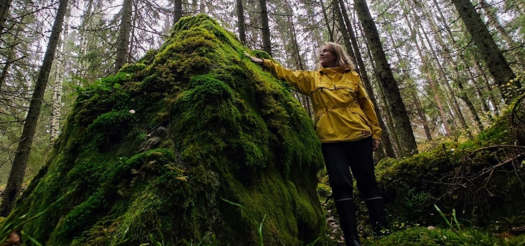 Löydän kuusien keskeltä kiven, jota en ole tavannut ennen. Vietän sen seurassa lopulta ainakin parikymmentä minuuttia seisoskellen ja kyykkien, näkö-, kuulo-, haju- ja tuntoaistejani hemmotellen. Kiven rosoista pintaa peittää uskomaton kirjo lokakuisen vehreää, kosteaa elämää. Erilaisia sammalia ja jäkäliä on kerroksittain, ja erotan pinnalta myös ainakin kaksi eri saniaislajia sekä muita metsän kasveja, joiden nimiä en tiedä. Kiven helmoilla kasvavat suppilovahverot syvässä sammalessa, ja murikan alla on vieläpä pieni onkalo.