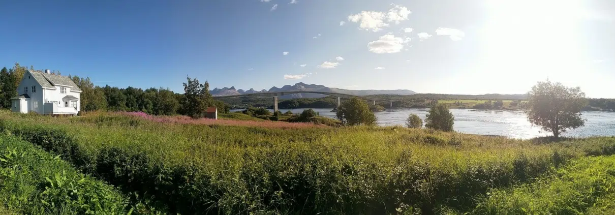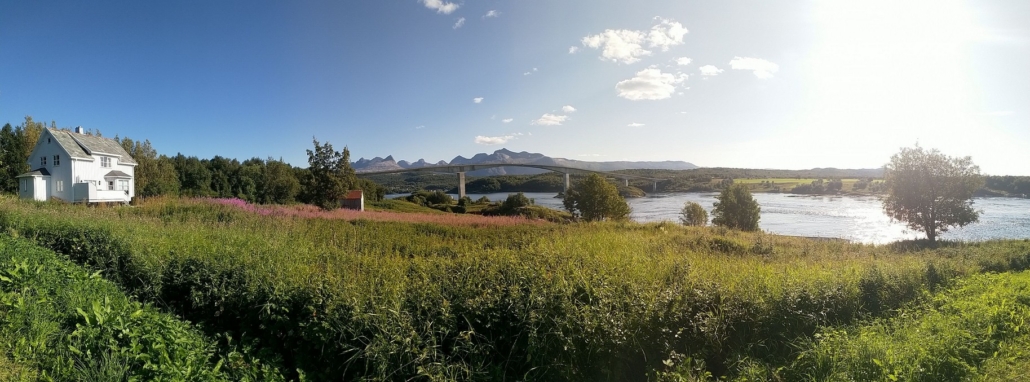 Saltstraumenin salmi ja silta näkyvät kaukana. Niin se vain etäisyyden hahmottaminen ihmisellä heittää, koska sillalta katsottuna tämä huippu näytti olevan huomattavasti lähempänä. Täältä saa myös käsityksen kuinka suuri vuono on kyseessä, jonka vesi salmen läpi vaihtuu, vaikka koko vuonoa ei edes näe. Se kääntyy oikealla vielä kohti etelää ja Rognan kaupunkia.