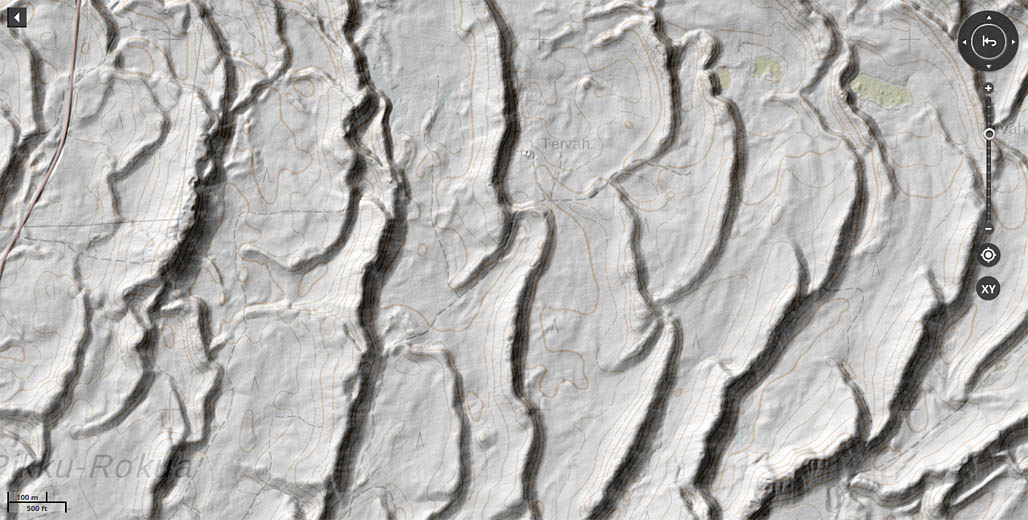 - Jääkauden synnyttämiä jään virtaussuuntaan nähden poikittaisia De Geer -moreeniselänteitä Hyvinkään ja Mäntsälän rajaseuduilla. Kuva Paikkatietoikkunasta, aineisto maanmittauslaitos.